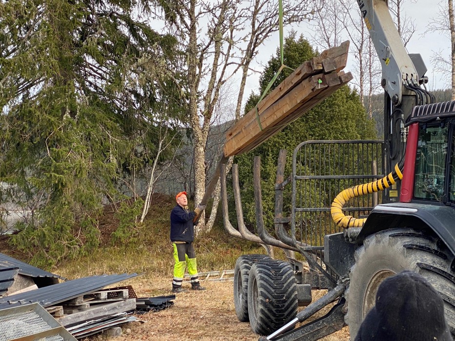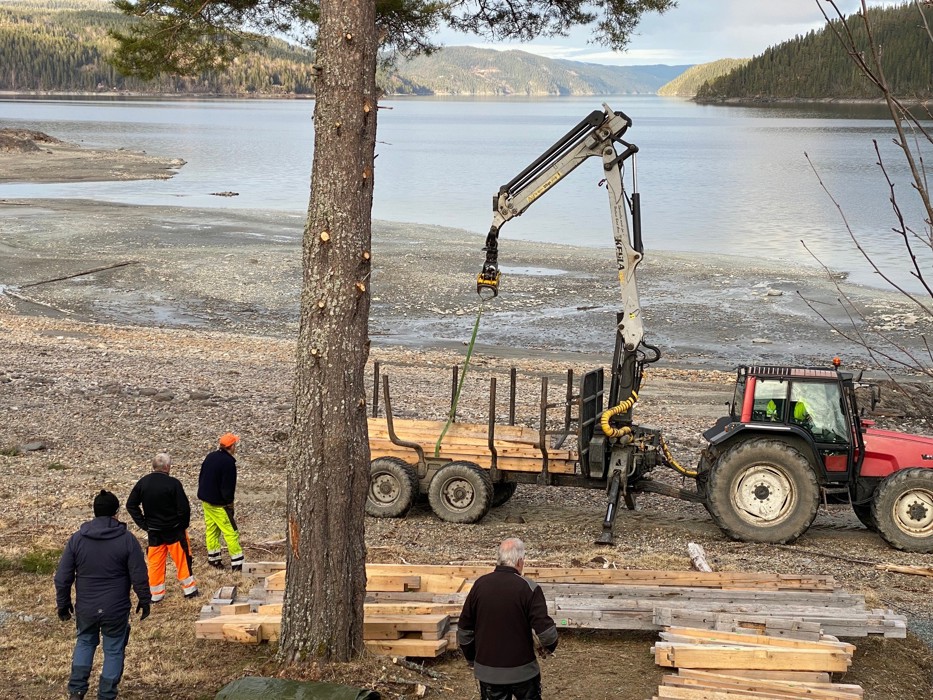 Materialene til naustet ble flyttet ned til sjøen slik at byggingen kan starte opp.