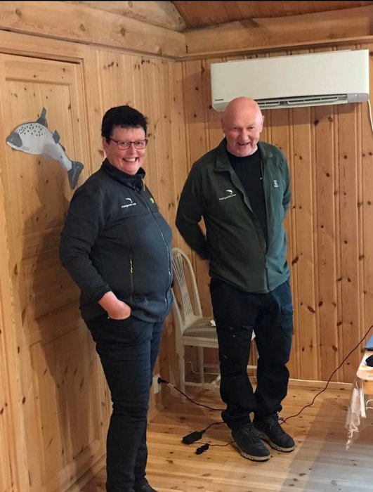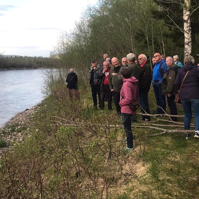 Mange medlemmer kom til et pyntet servicebygg ved elva Gaula. Vi fikk gårdens historie av Siri og Finn med vekt på laksefiske som er hovedgeskjeften deres nå på et av Gaulas beste laksevald.