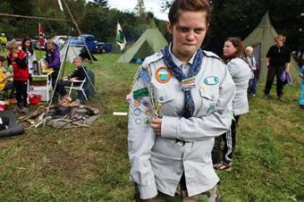 Vi møtte Siri som er aktiv speider, hun kunne fortelle at de allerede fredag kveld hadde rigget opp leiren med telt og bålplasser. Utpå natta hadde de fått besøk av en rev som hadde rotet i proviantlageret. Lørdagen hadde gått med til å sette opp portalen inn til leiren og en karusell, alt bundet sammen med tauverk på ordentlig speidervis, ingen spiker der nei...