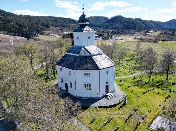 Dagens kirke som stod ferdig i 1790 er plassert på en sentral plass i bygda.